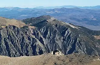 Lee Vining Peak is an 11,690-foot-elevation (3,560-meter) summit located in the Sierra Nevada mountain range, in Mono County of northern California, United States.[4] The mountain is set within the Hoover Wilderness, on land managed by Inyo National Forest. The peak is situated north of Lee Vining Canyon, and 1.8 miles (2.9 km) southeast of Mount Warren, which is the nearest higher neighbor. Topographic relief is significant as the summit rises 5,300 feet (1,600 meters) above Mono Lake in less than four miles (6.4 km), and 4,000 feet (1,200 meters) above Lee Vining Creek in two miles (3.2 km).