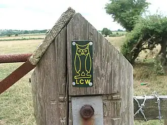 The route is waymarked with an owl symbol, outlined in yellow, and the letters "LCW" in yellow, on a green background.[1] Owls are included in the coat of arms of Leeds, and are found in many pieces of public art in the city centre.[22][23]