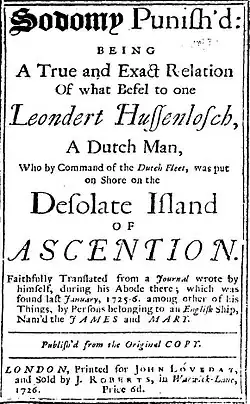 Title page of 'Sodomy punish'd: Being a true and exact relation of what befel to one Leondert Hussenlosch, a Dutch man, who by command of the Dutch fleet, was put on shore on the desolate island of Ascention.' John Loveday, London 1726.