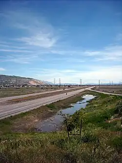 The parkway begins at an incomplete interchange with I-215 in extreme northern Salt Lake County near the Jordan River Off-Highway Vehicle State Recreation Area. The interchange allows motorists from the Interstate to transfer onto Legacy Parkway and travelers to access I-215 southbound. After about 1⁄4 mile (400 m), Legacy Parkway enters Davis County, and heads northerly with two lanes in each direction through semi-rural Woods Cross. The parkway then turns northeasterly and back north again, meeting 500 South at a diamond interchange, which also provides a connection to Redwood Road (SR-68). The eastern border of the Legacy Nature Preserve is formed by the parkway as it travels north. In West Bountiful, the parkway curves to the northeast as it follows the contour of the wetlands which lie on the western side of the road. Before reverting to its original northerly direction, the route meets Parrish Lane (SR-105) at another diamond interchange. Past the interchange, Union Pacific Railroad and Utah Transit Authority (FrontRunner) railroad tracks run between the parkway and I-15 to the east. For the remainder of the parkway's length, I-15 is located approximately 300 feet (91 m) east. Upon entering Farmington, the parkway gains one lane in each direction and intersects with the West Davis Corridor before terminating at a triple-junction with I-15, SR-225 and U.S. Route 89 west of Lagoon.[5][6] This interchange is referred to as the Wasatch Weave.[7]