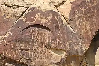 Legend Rock Petroglyph Site is located in Hot Springs County, Wyoming, 20 miles northwest of Hot Springs State Park (which is located in Thermopolis, Wyoming). Legend Rock is a petroglyph site which features hundreds of individual petroglyphs spread across the face of the rock. Although a handful of the rock's etchings have variously been eroded and defaced, a wide majority have been preserved for public viewing.[1] The nearly 300 individual petroglyphs feature some of the oldest and best examples of Dinwoody rock art in the world.[2] The origins of the petroglyphs are still subject to debate. The site was listed on the National Register of Historic Places on July 5, 1973[1] and it is preserved by the state of Wyoming as a state historic site.