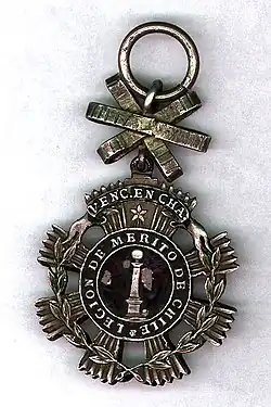 The Legion of Merit of Chile (Spanish: Legion de Mérito de Chile), frequently abbreviated to the Legion of Merit or the Legion, was a Chilean multi-class order of merit established on 1 June 1817 by Bernardo O'Higgins to recognise distinguished personal merit contributing to the independence of Chile or to the nation. Membership of the Legion conferred a variety of privileges in Chile and its members were entitled to wear insignia according to the class conferred. The Legion of Merit of Chile was abolished in 1825.