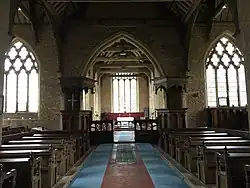 The 14th-century chancel has a four-light east window with original jambs, but a late-15th-century depressed four-centred head; on the north side of it a 13th-century capital (now mutilated) has been built in as a bracket. The north wall has two original three-light windows with intersecting tracery in a two-centred head; a late-15th-century three-light window with a depressed four-centred head; and a 13th-century locker with trefoiled head and stone shelf. The south wall has three windows similar to those on the north; a small late-15th-century doorway; a blocked original doorway, only visible inside; a blocked low-side window; a reset 13th-century double piscina having one whole and two half semicircular intersecting arches with interpenetrating mouldings, carried on a central shaft and two detached jamb-shafts with moulded capitals and bases. The 13th-century chancel arch is two-centred, of two chamfered orders, the lower order resting on triple attached corbel-shafts with moulded capitals and modern corbels. The roof is modern, but the moulded principals of 1626 remain. The weathering of the earlier roof remains above the chancel arch.