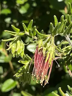 Leionema carruthersii is a small shrub up to 1 m (3 ft 3 in) high. It has oval to lance shaped leaves about 0.7–1.2 cm (0.28–0.47 in) long, 1.5–5 mm (0.059–0.197 in) wide, rolled edges and either heart shaped or squared at the leaf base on needle-like stems that have occasional fine, weak hairs. The leaves are widely spread with a short petiole and the surface is scantily covered with soft, fine, individual hairs. The inflorescence consists of 4-10 pendulous flowers on a pedicel 2–5 mm (0.079–0.197 in) long. The yellowish-green flowers, rarely red, have distinctive, long, red stamens that are considerably longer than the 7–9 mm (0.28–0.35 in) long petals. The flowers are borne at the end of branches arising from the leaf axils or bracts. The calyces are long, cone-shaped with small, triangular lobes. The seed pod is rough with a warty surface, about 5.5 mm (0.22 in) long with two small horn-like protuberances. Flowering occurs in winter.[2][3][4]