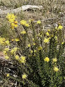 Leionema diosmeum is a shrub to 2 m (6 ft 7 in) high with smooth branches, leaves usually needle-shaped or occasionally oval to lance shaped,0.4–2 cm (0.16–0.79 in) long, 1–4 mm (0.039–0.157 in) wide, rounded apex, upper surface smooth or covered in soft thin individual hairs or rarely fine rough hairs, lower surface with coarse star-shaped hairs. The inflorescence is a compact head at the end of branches, each flower in axils of linear bracts about 5 mm (0.20 in) long on a thick pedicel 1–2 mm (0.039–0.079 in) long, calyx is an inverted top shape and deeply lobed. The flower petals a creamish-yellow, light red on the outside toward apex, 4–7 mm (0.16–0.28 in) long with occasional hairs tipped with glands. The fruit are upright, about 4 mm (0.16 in) long with an angled beak. Bears clusters of yellow flowers in spring.[2]