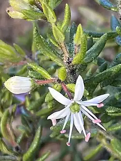 Leionema gracile is a small shrub to 1.5 m (4 ft 11 in) high, branchlets warty, more or less terete or marginally angular with separated, soft, thin hairs between the ribs. The leaves are a spreading formation, mostly smooth, oval to elliptic-oval, 5–10 mm (0.20–0.39 in) long, 1.5–2.5 mm (0.059–0.098 in) wide, edges smooth and slightly rolled under, leathery, and blunt or rounded at the apex. The single flowers are borne in the highest branches in leaf axils on mostly smooth pedicel about 0.5 mm (0.020 in) long. The small bracts are hair-like about 0.5 mm (0.020 in) long and fall off early. The calyx lobes are triangular shaped and smooth. The white flower petals are spreading, narrowly oval, 5 mm (0.20 in) long and sharply pointed at the apex, stamens similar length of petals. The fruit are about 4 mm (0.16 in) long ending with a short beak. Flowering occurs from autumn to spring.[2]