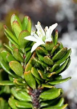 Leionema oldfieldii is a small shrub that is endemic to mountainous locations in Tasmania, Australia. It has dark green leaves, compact pale pink to white flowers from November to January.