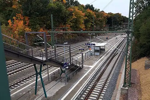 Leipzig-Völkerschlachtdenkmal is a railway station in the city of Leipzig, Germany. The station was opened in 1968 and located on the Leipzig Hbf–Leipzig-Connewitz railway until its closure in November 2012. As part of City Tunnel network enhancements it was rebuilt thereafter a few meters northeast at the former Leipzig-Stötteritz–Leipzig-Engelsdorf section of the Leipzig Freight Ring and reopened along with Leipzig City Tunnel on 15 December 2013.