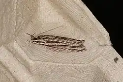 The wingspan is about 28 mm. The forewings are fuscous mixed with darker and with the veins mostly outlined by pairs of very fine white lines, those of 6 and 9 and the upper margin of the cell obsolete, the interspaces between the veins marked with suffused blackish streaks. There is a white streak through the middle of the cell from the base and the costal edge is finely white, the dorsal edge blackish. The hindwings are grey, darker posteriorly.[2]