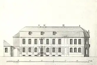 Szreger kept the original corps de logis (Szembek Mansion),[1] and adjoined the front building and the side wings modelling the ensemble on the French Hôtel particulier which was known to him from the books of Pierre-Jean Mariette (1727 and 1738) and Jacques-François Blondel (1752). The drawings of the exterior and the interior are well-preserved. For the staircase he designed wall paintings which differ only in marginal details from the wall paintings in the staircase of the Appartement des Princes in the Palace of Versailles which will have been well known in Poland through engravings in the third volume of 1738 of Mariette's L'Architecture française. The left wing of the ensemble was added by the architect Szymon Bogumił Zug after Constance Jauch had sold the estate.[1]