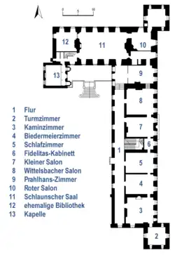 The former dining room has the thickest wall in the wing, with a thickness of 2.30 meters in the east. A wall divides the rectangular room into a hall-like passage of 2.55 × 6.35 meters and an almost square cabinet with a floor plan of 5.90 × 6.35 meters. The former dining room with its classicist stuccowork from the end of the 18th century owes its nickname Red Salon due to its wall covering of red silk damask.[19]