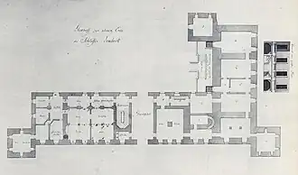 Unlike other Baroque castles, the interior layout of Lembeck does not follow the typical hierarchical arrangement of rooms centered around a central hall. This can be attributed to the limitations imposed by the existing building structure during the construction work in the last quarter of the 17th century. Instead, the interior design adopts the cabinet system in Enfilade, which features a series of interconnected rooms following French models. It is worth noting that this design choice was already falling out of fashion in France during the time of construction.[11] Despite following the Enfilade style, the alignment of the room passages does not strictly adhere to a straight line.