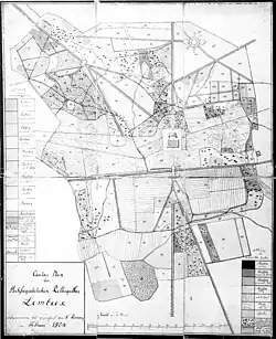 After reconstruction work from 1674 to 1692, a baroque garden based on the French model with symmetrical path axes was laid out to the west of the castle according to designs by August Reinking. An 1804 survey of Lembeck’s landscape shows how the "all-pervading" east-west axis of the complex ended in the wooded area of the "Hagen".