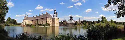The Lembeck meadow stream has been dammed on the castle grounds to form a rectangular pond that spans an area of 190 × 160 meters, encircling the entire complex. As a result, the various parts of the castle are situated on an island that is interconnected by bridges.[2]
