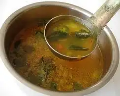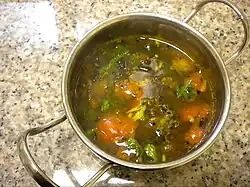 Rasam (Tamil: ரசம்) or saatramudhu (Tamil: சாற்றமுது) is a spicy South Indian soup-like dish.[1] It is usually served as a side dish with rice. In a traditional South Indian meal, it is part of a course that includes sambar rice. Rasam has a distinct taste in comparison to sambar due to its own seasoning ingredients and is watery in consistency. Chilled prepared versions are marketed commercially as well as rasam paste in bottles.[2]
