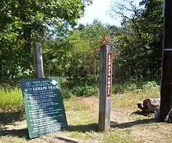 The Lenape Trail is a trail through Essex County, connecting many county parks and reservations, wooded spaces, and historical sites. It begins in Newark, New Jersey and ends in Millburn, New Jersey. It was established in 1982.[1] It is the fifth longest trail in the state behind the Delaware and Raritan Canal Trail, the Appalachian Trail, the completed section of the Highlands Trail in the state and the Batona Trail. The Lenape trail traverses Newark and its suburbs, as well as the Watchung Mountains and Passaic Meadows. Because of the steepness of the Watchung Mountains and the flood-prone nature of the Passaic Meadows, the former basin of Glacial Lake Passaic, these areas have remained much less developed than the rest of the northeastern part of the state. This trail therefore offers hikers an opportunity to see cultural and historical sites of an urban trail, as well as large natural and undeveloped areas. The trail's proximity to New York City and the various ridges it traverses, including Forest Hill, Orange Mountain (part of First Watchung Mountain), and Second Watchung Mountain, offer many views of the skyline. The Lenape Trail forms a segment of the Liberty-Water Gap Trail[2] and incorporates the West Essex Trail, the Lenape Trail's only rail-to-trail section. The Lenape Trail also connects with Morris County's Patriots Path trail system on its western terminus.