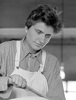![]() Lenore Thomas at work on a sculpture for the Resettlement Administration (1936) | |