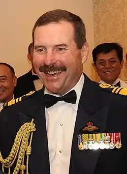 Davies' "distinguished service" in senior command and staff positions was recognised with his appointment as an Officer of the Order of Australia in the 2014 Australia Day Honours. The citation described Davies as "the epitome of professionalism who has distinguished himself through exceptional leadership in shaping the Royal Australian Air Force of the future".[5] The following year, he was selected as the next Chief of Air Force (CAF); the professional head of the RAAF. He was promoted air marshal and succeeded Air Marshal Geoff Brown as CAF on 4 July 2015.[2] Davies was awarded Singapore's Meritorious Service Medal in October 2016 and,[6] in September 2018, he was appointed an Officer of the Legion of Honour by the French government.[7]