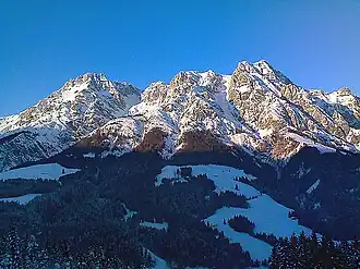 The Leogang Mountains[1] (German: Leoganger Steinberge, lit. "Leogang Rock Mountains") are a mountain range in Austria in the state of Salzburg and form part of the Northern Limestone Alps within the Eastern Alps. They are located between the Lofer valley, Saalfelden and Leogang and, together with the Lofer Mountains to the northwest, form two mountain massifs that are separated by the saddle of the Römersattel (1,202 m), but which the Alpine categorisation of the Eastern Alps defines as a single sub-group (the Lofer and Leogang Mountains). The Leogang Mountains are separated from the Kitzbühel Alps to the south and the Steinernes Meer to the east by deeply incised valleys. Typical of the Steinberge are high plateaux with steep sides and sharply undulating high cirques.