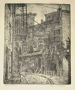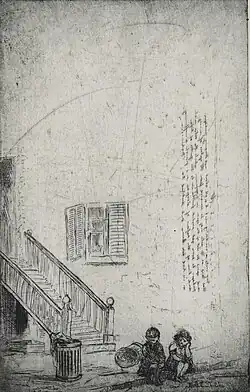 In August 1924, novelist and journalist Leonard Cline posted a column that noted Dolice's sales technique. He said the artist caused a stir when he visited the newspaper's city room to offer up copies of his etchings at 50 cents each. The prints included scenes of Washington Square Arch, the Woolworth Building, and the East River. Cline discussed one print at some length. This print, which Dolice called "The Misery", showed, as Cline said, "vague uncertainties" on a wall, including "vestiges from an earlier etching on the same plate, which had been polished down laboriously by an artist too poor to buy metal."[3] When, in September, Dolice traveled to Baltimore, the Baltimore Sun interviewed him about his plans to make etchings of city landmarks[7] and in November the paper reviewed an exhibition of the resulting prints at the Peabody Institute.[7]
