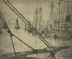 One writer discussed the unusual elements of design in a 1922 etching that Dolice called "The Misery". He called attention to the balance of the composition, the appearance of writing in one quadrant, and what he called "vague uncertainties".[3] In discussing another 1922 etching—one showing boats on the East River— this writer called attention to the "sensitive composition" of foreground elements—a boom with its halyards—against a background cluster of docked sailboats.[3]
