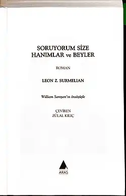 In 1945, Surmelian published I Ask You, Ladies and Gentlemen, an autobiography of his life during the Armenian Genocide in English which would later be translated into Italian, Swedish, Czech, and Turkish.[2]