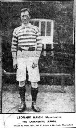 Haigh took up rugby late in life, playing for Manchester Rugby Club. From there, he earned selection for Lancashire on eighteen occasions,[2] including the match on 25 November 1908 against Australia, then on tour in Britain.[3] He gained his first cap for England at the age of 30, against Wales on 15 January 1910, in the host nation's first match at Twickenham.[4] In the last of the trials matches before the game, Haigh was selected for the Rest against England, and was on the winning side, with England's forwards especially marked out for criticism. The 10–19 defeat caused problems for the selectors, who delayed announcing the team to face Wales.[5] When they did, two days later, Haigh was included in the line up,[6] and on the day, England, who had lost the previous five encounters, beat the Welsh 11–6.[7] He kept his place in the team for the match against Ireland, on 12 February, with the England selectors keeping the same team, with the exception of Mobbs replacing Poulton.[8] After missing the game against France, he played in the match against Scotland on 19 March, but only after another player withdrew from the team.[9]