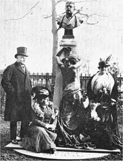 Braham continued to perform, from 1897 to 1912, in London, the British provinces, and New York.[4][39] In 1897, she was touring as Norah in Charles Villiers Stanford's opera Shamus O'Brien and as the Countess in Olivette, followed by Juanita in The Dove-Cot, adapted by Charles Brookfield from La Jalouse, at the Duke of York's Theatre in London.[40] On Broadway, she played Donna Adelina Gonzales in Because She Loved Him So, the American adaptation of The Dove-Cot, at Hoyt's Theatre in 1899.[41] The following year, she toured in Britain with a company using the name of the German Reed Entertainments.[42] She also toured for two years with Lillie Langtry in plays without music,[36] including The Degenerates.[40] Later roles included the Widow Melnotte in The Lady of Lyons and Madame Michu in The Little Michus. Her last role was as Amelia Dovedale in Captain Scarlet at the St James's Theatre in 1912.[40] Together with George Power, Jessie Bond and Julia Gwynne, she was one of four artistes of the original D'Oyly Carte Opera Company who attended a reunion at the Savoy Hotel in 1914. The four then posed for a group photograph beside the Arthur Sullivan Memorial in the Victoria Embankment Gardens (see photo).[43]