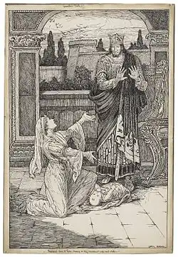 King Leontes is a fictional character in Shakespeare's play The Winter's Tale. He is the father of Mamillius and husband to Queen Hermione. He becomes obsessed with the belief that his wife has been having an affair with Polixenes, his childhood friend and King of Bohemia. Because of this, he tries to have his friend poisoned, has his wife imprisoned, and orders his infant daughter to be cast out. The daughter, Perdita, survives nonetheless when she is discovered in her basket on the coast of Bohemia by shepherds who adopt and raise her.[1] His young son dies of grief at his mother's plight, and Hermione faints on hearing the news and is reported dead. Leontes comes to understand his faults, and is filled with remorse for his ill-treatment of his Queen. At the end of the play, he is reunited with daughter and his wife, who returns from death in the play's mysterious finale.
