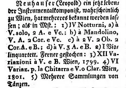 Bone also wrote of Neuhauser's "many unpublished manuscripts for the mandolin and guitar and also four instrumental nocturnes"[1] Konrad Wölki wrote of Neuhauser's four "Notturni for mandolin, violin, two horns and violincello" which were published in handwritten-manuscript form by Johann Traeg, 1799, Vienna.[3]