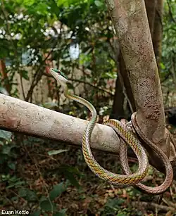 L. ahaetulla feeds on small birds and their eggs, lizards, frogs and their eggs, and insects such as grasshoppers.[6] It is also known to show cannibalism and feed on other snakes which is a rare behaviour.[6]