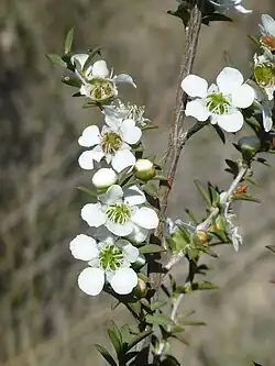 Leptospermum continentale, commonly known as prickly tea-tree,[2] is a species of slender, straggling shrub that is endemic to south-eastern Australia. It has sharp-pointed, narrowly egg-shaped leaves, white flowers arranged singly in leaf axils and woody fruit that remains on the plant when mature.