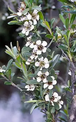 Leptospermum obovatum, commonly known as river teatree,[2] is a species of shrub that is endemic to south-eastern continental Australia. It has egg-shaped or lance-shaped leaves that are narrower at the base, white flowers usually arranged singly on short side shoots and fruit that remains on the plant until it dies.