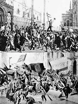Already on December 24, protesters against high excise duties had sacked and burned tollhouses.[2][7] Royal Italian Army troops were sent to the town. The next day, on Christmas, several thousand protestors gathered again at the central square before the municipality. Their shouts Down with taxes! Down with the mayor! were greeted with Death to the instigators! from the balconies of the houses of the affluent on the main square.[2][4]