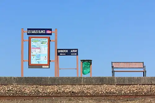 Les Sables-Blancs halt (French: Halte des Sables-Blancs) is a railway halt situated at the entrance to the Quiberon peninsula in the commune of Plouharnel, Morbihan department of Brittany, France. The halt is located at kilometric point (KP) 601.710 on the Auray–Quiberon railway. The station is served seasonally during summer months only by TER Bretagne services operated by the SNCF, between Auray and Quiberon.[1]