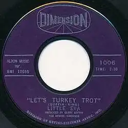 "Let's Turkey Trot" is a popular song with writing credits to Gerry Goffin and Jack Keller and/or Carole King. It was released by Little Eva as her third single for the Dimension label. The Little Eva's recording debuted on the charts on February 2, 1963, and peaked at #20 on the Hot 100. It was her third top 40 record. In Canada it reached #23, her third of four in the top 25.[1]