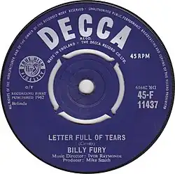 "Letter Full of Tears" was a departure for Fury from his previous rock and roll and pop ballad releases. It was his first R&B single, though he had been singing R&B songs on stage for a while.[6] It was recorded in November 1961, soon after the release of Gladys Knight & the Pips' version, and released in February 1962.[5] It was released with the B-side "Magic Eyes", written by Americans Dorian Burton and Herb Bernstein.