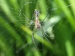 - ^ a b Eberhard, William G. (1990). "Early Stages of Orb Construction by Philoponella Vicina, Leucauge Mariana, and Nephila Clavipes (Araneae, Uloboridae and Tetragnathidae), and Their Phylogenetic Implications". The Journal of Arachnology. 18 (2): 205–234. ISSN 0161-8202. JSTOR 3705838.