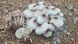 Leucoagaricus meleagris is a small dapperling mushrooms with white flesh in the cap and brown flesh in the stem.[15]