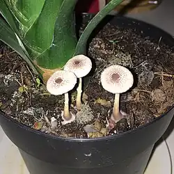 - Leucocoprinus brebissonii can appear similar but is distinguished by the darker brown colour of the centre disc and the white stem which lacks a purplish base. It is more commonly found in the wild rather than in plant pots.