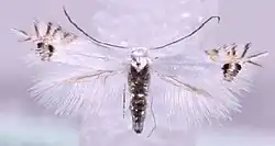 The moth differs from Leucoptera lathyrifoliella as follows : forewings with last two dark bars in apical cilia much less divergent, forming an angle of about 15°.[1]
