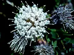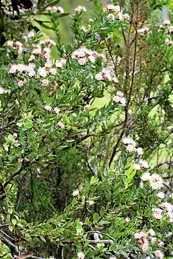 Leucospermum bolusii is a shrub native to South Africa. It grows to 1.5 m (4 ft 11 in) in height, and has nearly hairless leaves with a single apical tooth. The leaves are oval shaped and range from 25–45 mm (0.98–1.77 in) in length. The flower heads are about 2 cm in diameter, slightly flattened globe shaped, are set on a stalk of about 1 cm and crowded with up to eight together at the tip of the branches. They each contain 50–100 small, sweetly scented creamy white flowers, that later turn light pink. Flowering takes place between September and December. It is called Gordon's Bay pincushion in English and witluisiesbos in Afrikaans.[3][4]