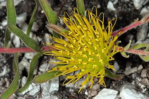 The bract that subtends each flower individually is inverted lance-shaped, suddenly pointy or pointed 5−6.0 mm (0.20−0.24 in)long and about 1½ mm (0.06 in) wide, cartilaginous in consistency, and the surface very thickly woolly. The 4-merous perianth is 2–2½ cm long, greenish at the base and yellow higher up. The lowest, fully merged, part of the perianth, called tube is funnel-shaped, 8 mm (0.32 in) long, hairless, but minutely powdery near the top. The middle part (or claws), where the perianth is split lengthwise are thread-shaped (or filiform), tightly rolling back near the top, the lobe facing the edge of the head hairless, the other roughly hairy. The upper part (or limbs), which enclosed the pollen presenter in the bud, consists of four 1 mm (0.04 in) long, pointy, narrowly lance-shaped lobes that are difficult to distinguish from the perianth claws. From the perianth emerges a straight, thread-shaped style of 2½–3 mm (0.10–0.12 in) long, that tapers towards the tip, and is initially yellow, later becoming pale green. The thickened part at the tip of the style called pollen presenter is 1.0 mm long, cylinder-shaped with a pointy tip, hardly differentiated from the style, with a groove that functions as the stigma across the very tip. The ovary is subtended by four opaque, hoof-shaped scales of about 3 mm long.[2]