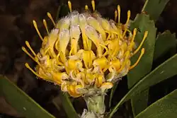 The flower heads are set individually or in groups of two to four together, globe-shaped 2–3 cm (0.79–1.18 in) in diameter, each set on an inflorescence stalk of 1–2 cm (0.39–0.79 in) long. The common base of the flowers in the same head is broad conical in shape, approximately 1 cm (0.39 in) long and 8 mm (0.31 in) wide, which is subtended by oval bracts with a pointy tip, 7–8 mm (0.28–0.31 in) long and about 4 mm (0.16 in) wide, tightly overlapping, rubbery in consistency, greyish softly hairy. The bracts that subtend the individual flower are broadly oval with a pointy tip, about 7 mm (0.28 in) long and 5 mm (0.20 in) wide, rubbery in consistency, with dense woolly hairs at their base and rubbery in consistency. The 4-merous perianth is 1+1⁄4–1+1⁄2 cm (0.49–0.59 in) long, pale to greenish yellow in colour. The lowest, fully merged, part of the perianth, called tube, is about ½ cm (0.2 in) long, cylindric in shape or slightly laterally compressed, hairless at base and minutely powdery where it merges into the middle part (or claws) where the perianth is split lengthwise, which is also powdery or have very short hairs. The upper part (or limbs), which enclosed the pollen presenter in the bud consists of four narrowly lanceolate lobes of about 2 mm (0.079 in) long, with the outer surface of the limbs facing sideways and to the center of the flower head have a tuft of long hairs, the lobe facing the rim of the flower head hardly so. From the perianth emerges a straight style, 1+1⁄4–2+1⁄4 cm (0.49–0.89 in) long, topped by a very slight thickening called pollen presenter. That is cylinder-shaped, about 1 mm (0.039 in) long, with the very end split in two. The ovary is subtended by four pale yellow, awl-shaped nectar producing scales of about 1 mm (0.039 in) long.[2]