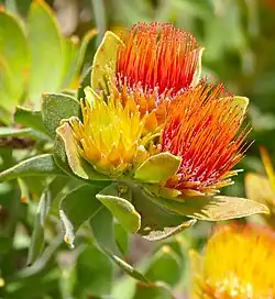 The cup-shaped flower heads are each 2½–4 cm (1.0–1.6 in) in diameter, almost without a peduncle, with two to five crowded at the end of the branches, occasionally on its own. The floral base is flat and 12 mm (0.47 in) in diameter. It is covered below by felty to hairless, papery, egg-shaped, long pointed, overlapping involucral bracts of 9–36 mm (0.35–1.42 in) long and 5–7 mm (0.20–0.28 in) wide, sometimes with a tuft of long hairs at its tip. The papery bracts at the base of the individual flowers are very narrowly lance-shaped, 1–3 cm (0.39–1.18 in) long, wooly near the base and softly hairy towards the tip. The individual flower bud is a straight tube of about 2 cm (0.79 in) long, slightly transparent, initially whitish-transparent to pale yellowish green, yellow when opening, quickly becoming orange and turning bright crimson with age. When the flower opens, a cylindrical, hairless tube of 8 mm (0.31 in) remains that widens towards the top, and four thread-shaped lobes that are strongly curled on itself. The styles are initially strongly arched like a swan's neck, but straighten and grow quickly to a thread of 2½–3 cm (1–1¼ in) long, at first pale yellow but turning crimson when fully developed. The pollen-presenter, a slight thickening at the tip of the style (comparable with the "head" of the pin), is cylindrical, thread-like, only at its base slightly thicker than the style, 1 mm (0.039 in) long, the stigma a groove across the tip of the pollen-presenter. At the base of the ovary are for blunt thread-like opaque scales of about 2 mm (0.079 in) long.[2] The fruit is ellipsoid in shape, 7½ mm (0.3 in) long, the surface thinly covered with a fine powder.[5] The species flowers between August and January, peaking in September and October. Initially the flowers are bright yellow, but soon turn orange to end in a brilliant crimson, and they may remain vibrant for almost two months.[3]
