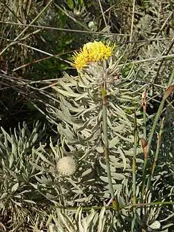 The globe-shaped flower heads of 3–3.5 cm (1.2–1.4 in) in diameter, without stalks, are grouped with one to four together. The common base of the flowers in the same head are low cone-shaped, about 1.3 cm (0.51 in) long and 1 cm (0.39 in) wide, and is subtended by pointy lance-shaped bracts of about 5 mm (0.20 in) long and 3 mm (0.12 in) wide, cartilaginous, tightly adpressed overlapping and set with short soft hairs with a tuft of long grey hairs at the tip.[2]