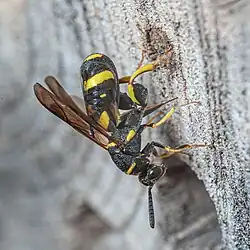 Leucospis dorsigera can reach a length of 10–12 millimetres (0.39–0.47 in).[4] This rather variable vespid-like specie mimics a stinging wasp. Body is quite robust, with yellow stripes on a black ground color. The fore wings are folded longitudinally. The hind femora are swollen and toothed along the lower margin, with a large median and short lateral teeth. The female shows a relatively short gaster and the ovipositor is turned up, lies along the dorsal side of the metasoma and just reaches to the base of the gaster. In the males the fusion of many of the metasomal segments to form a capsule-like "carapace".[2]