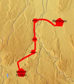 At the start of the line at Leutkirch station it turns northwest to the now disused Unterzeil station and then swings back sharply to the northeast towards Memmingen, passing through the stations of Altmannshofen and Aichstetten. This curve came about due to the interest of the Earl of Waldburg-Zeil in having a rail link to Unterzeil, which lies below Zeil Castle.[6] Aichstetten Shell siding is served daily by tankers hauled by private locomotives.