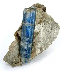 Kyanite specimen from Central St. Gotthard Massif, Leventina. This specimen features a 6 cm-long, doubly terminated kyanite in contrasting silvery mica matrix.