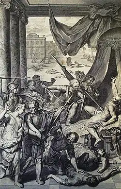 In the Book of Genesis, Levi and his brother, Simeon, raid the city of Shechem in revenge for the rape of Dinah, seizing the wealth of the city and massacring the men.[7] The brothers had earlier misled the inhabitants by consenting to Dinah's rapist marrying her in exchange for the men of the city to be circumcised. When Jacob hears about their deceit and destruction of Shechem, he scolds them since they've endangered their own family to the wrath of neighbouring societies.[8] In the Blessing of Jacob, Jacob is described as imposing a curse on the Levites, by which they would be scattered, in punishment for Levi's actions in Shechem.[9]